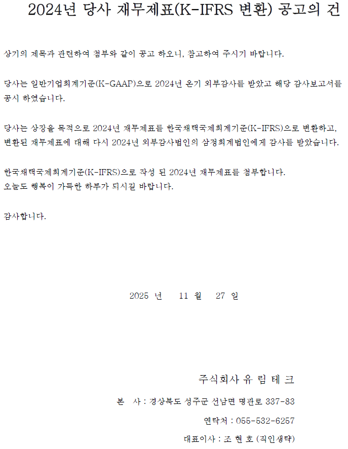 [공지] 2024년 당사 재무제표(K-IFRS 변환) 공고의 건